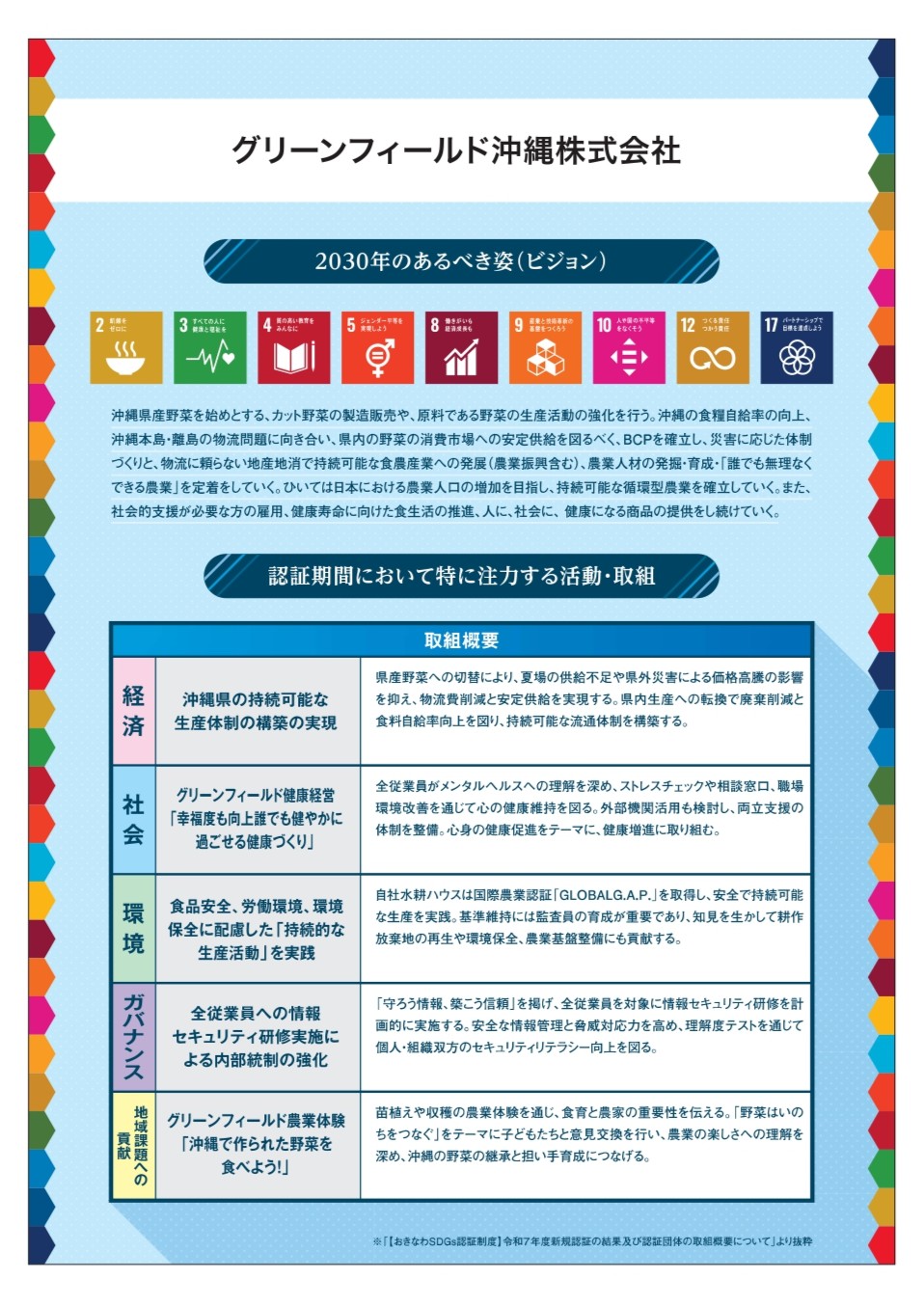 本制度は、SDGsの理念を尊重し、経済・社会・環境の3つの分野を意識した経営を実践する企業等を沖縄県が認証することで、